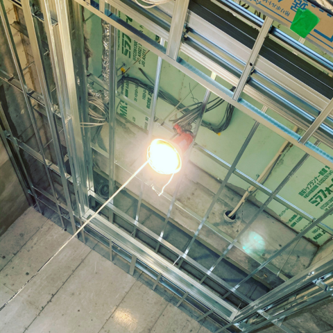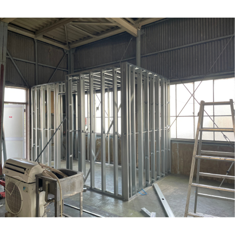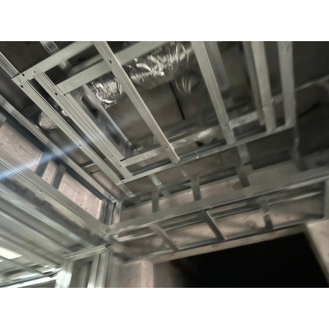 軽鉄工事とは、軽量の鉄骨材(LGS)を使って、建物の壁や天井の骨組み(下地)を組む工事のことです。軽天工事とも呼ばれ、石膏ボードなどを取り付けるための基礎となります。木材よりも火災に強く、加工が容易で工期短縮につながるなどのメリットがあります。